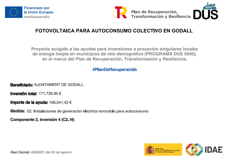 Aquesta actuació s'ha acollit a les ajudes regulades al Reial Decret 692/2021, de 3 d'agost, pel qual es regula la concessió directa d'ajudes per a inversions a projectes singulars locals d'energia neta en municipis de repte demogràfic (PROGRAMA DUS 5000), en el marc del Programa de Regeneració i Repte Demogràfic del Pla de Recuperació, Transformació i Resiliència.