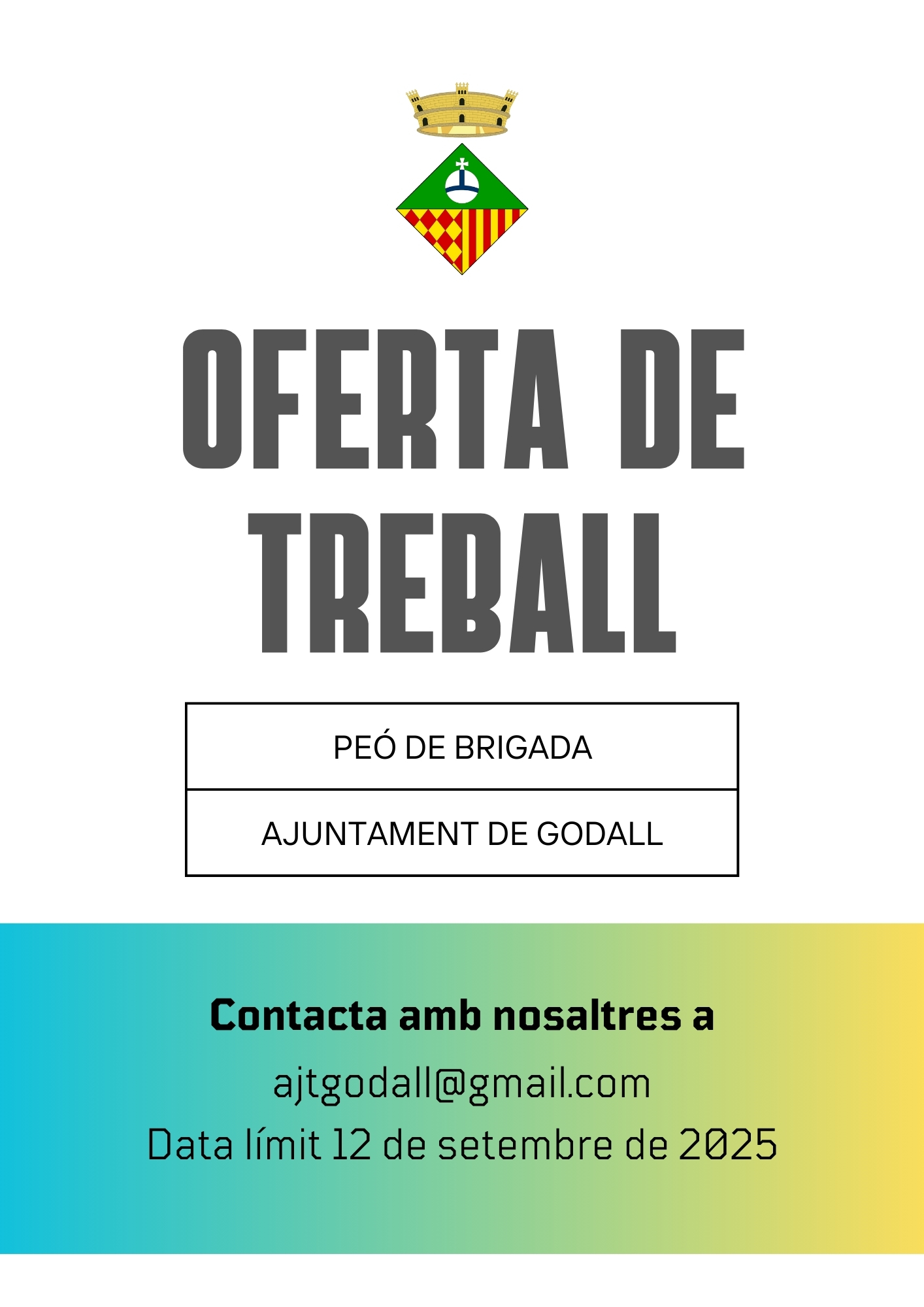 L'Ajuntament de Godall està interessat en la contractació d'un peó per a donar reforç amb caràcter temporal a la brigada municipal d'obres i serveis, amb motiu de la realització de vacances per part del personal. Es tracta d'un contracte laboral temporal a jornada completa.