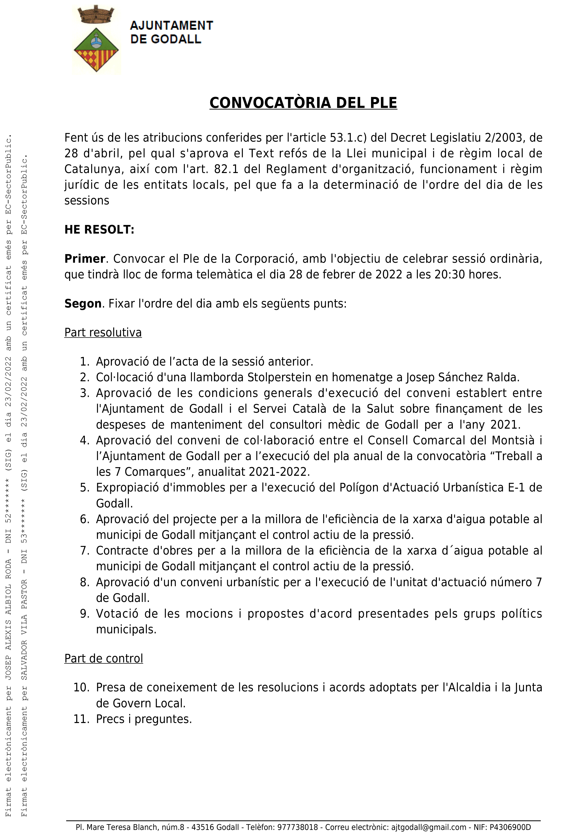 #ConvocatòriaPle #SessióOrdinària #28Febrer #Godall2022