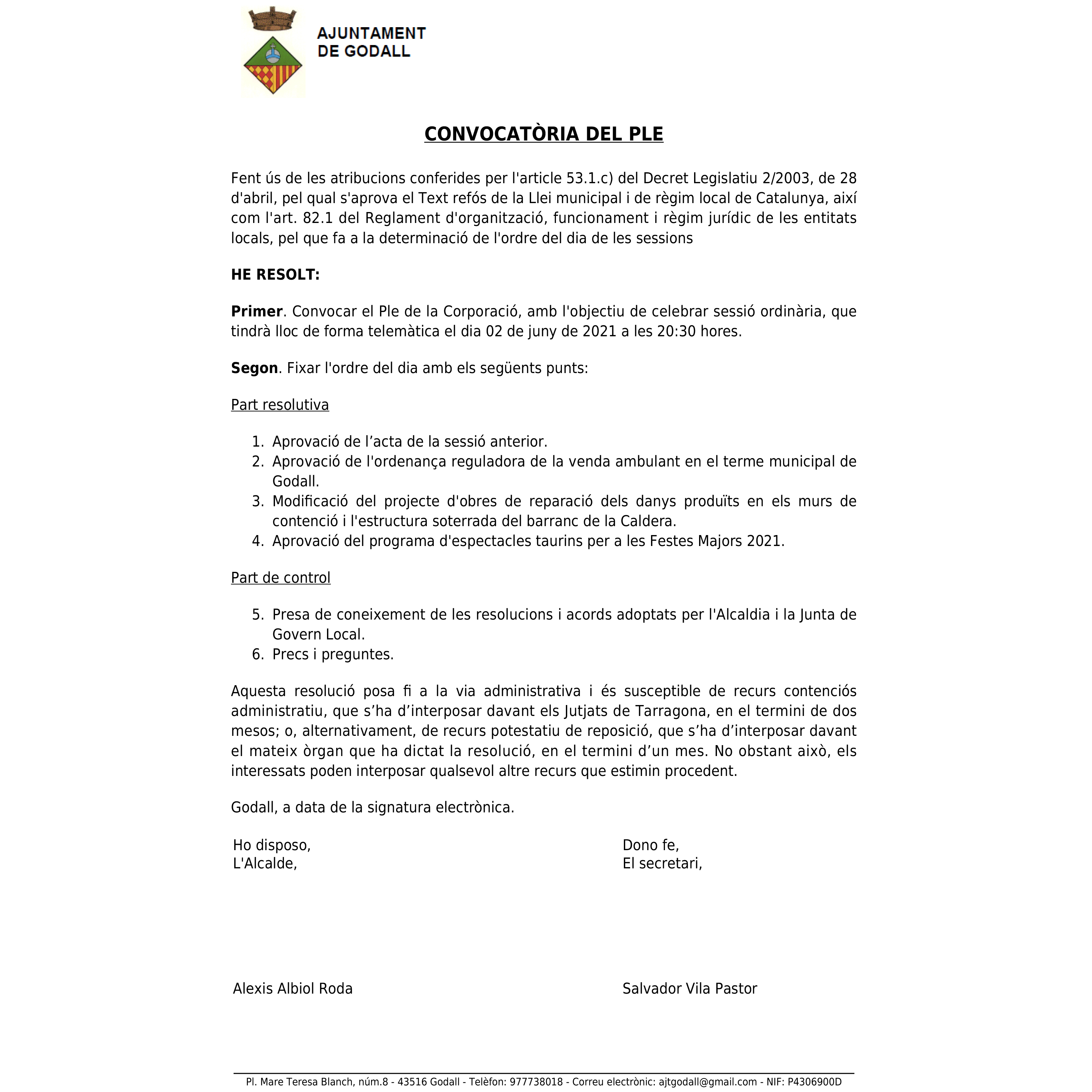 Convocatòria del Ple 02/06/2021