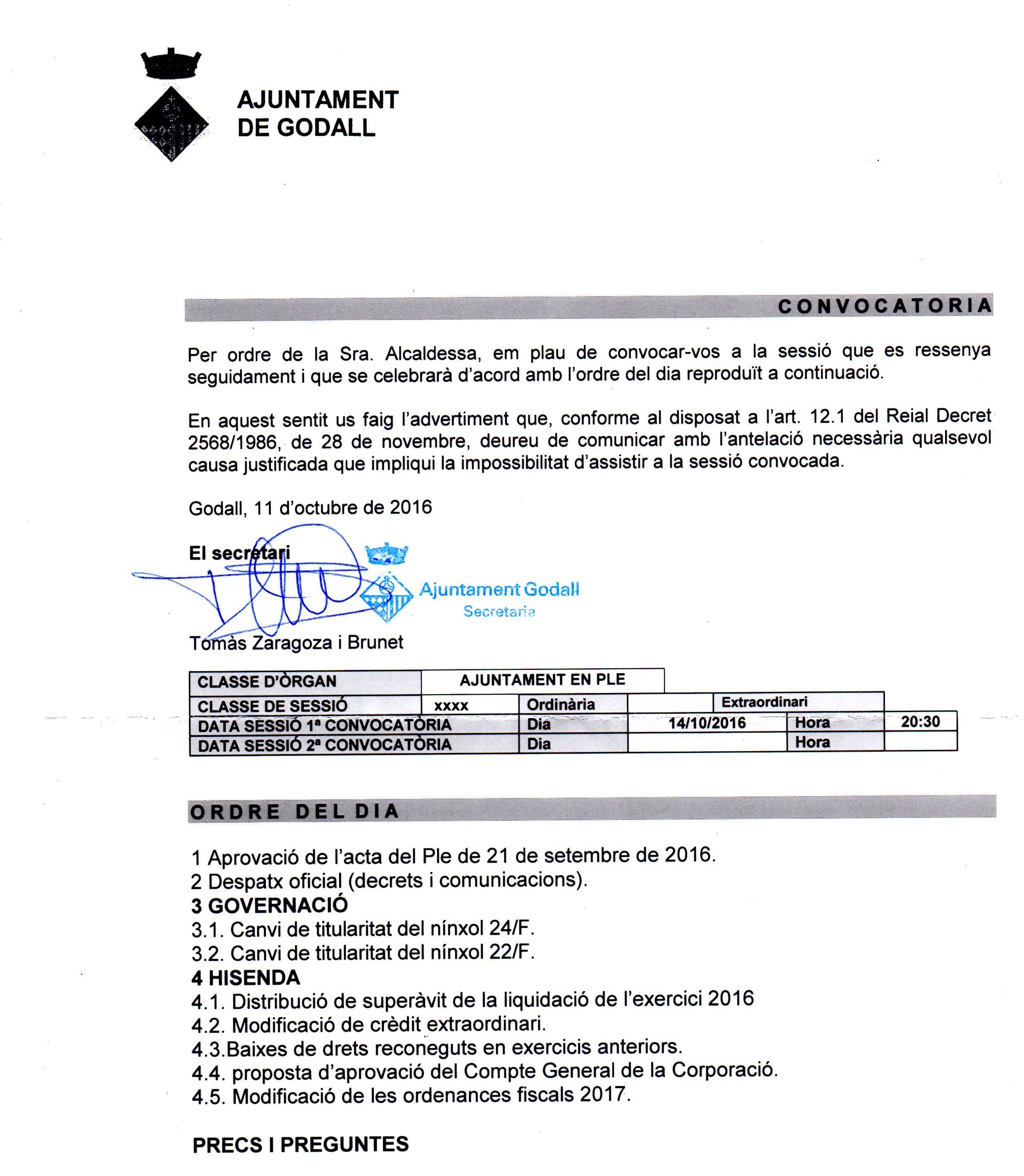 * CONVOCATÒRIA PLE CORPORACIÓ (Divendres 14/10/2016)