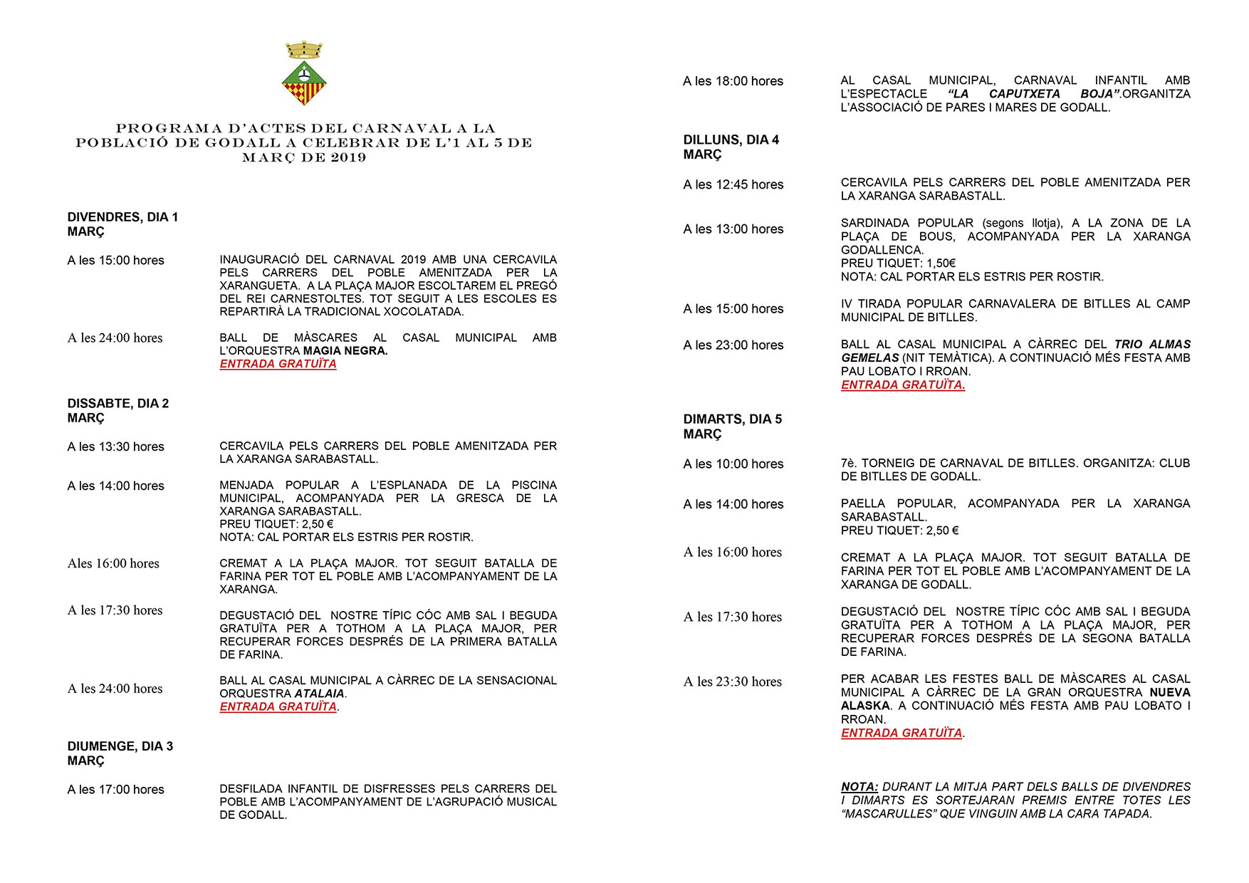 CARNAVALS 2019: De 1/03/2019 al 5/03/2019